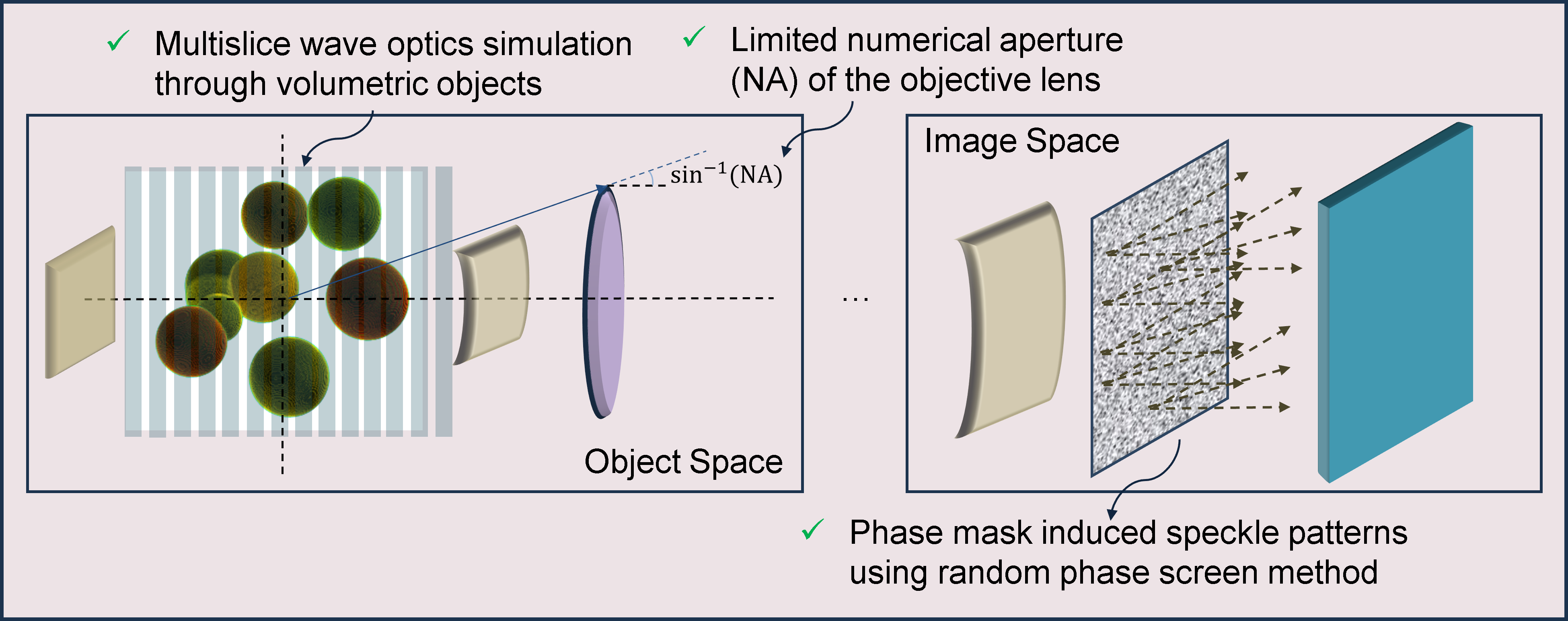 We restrict our volumetric specimens to randomized configurations of spherical objects. By randomly sampling the number of spheres, their radii, positions, refractive indices, and phase mask features (height and smoothing), we ensure that the network does not overfit to specific distributions of objects and remains agnostic to phase mask distributions. Additionally, spheres can be simulated very accurately (and quickly) as shown below, and in the coded WFS setting, where the main features in image space are speckles, we believe the finetuned networks will generalize to non-spherical objects as well.