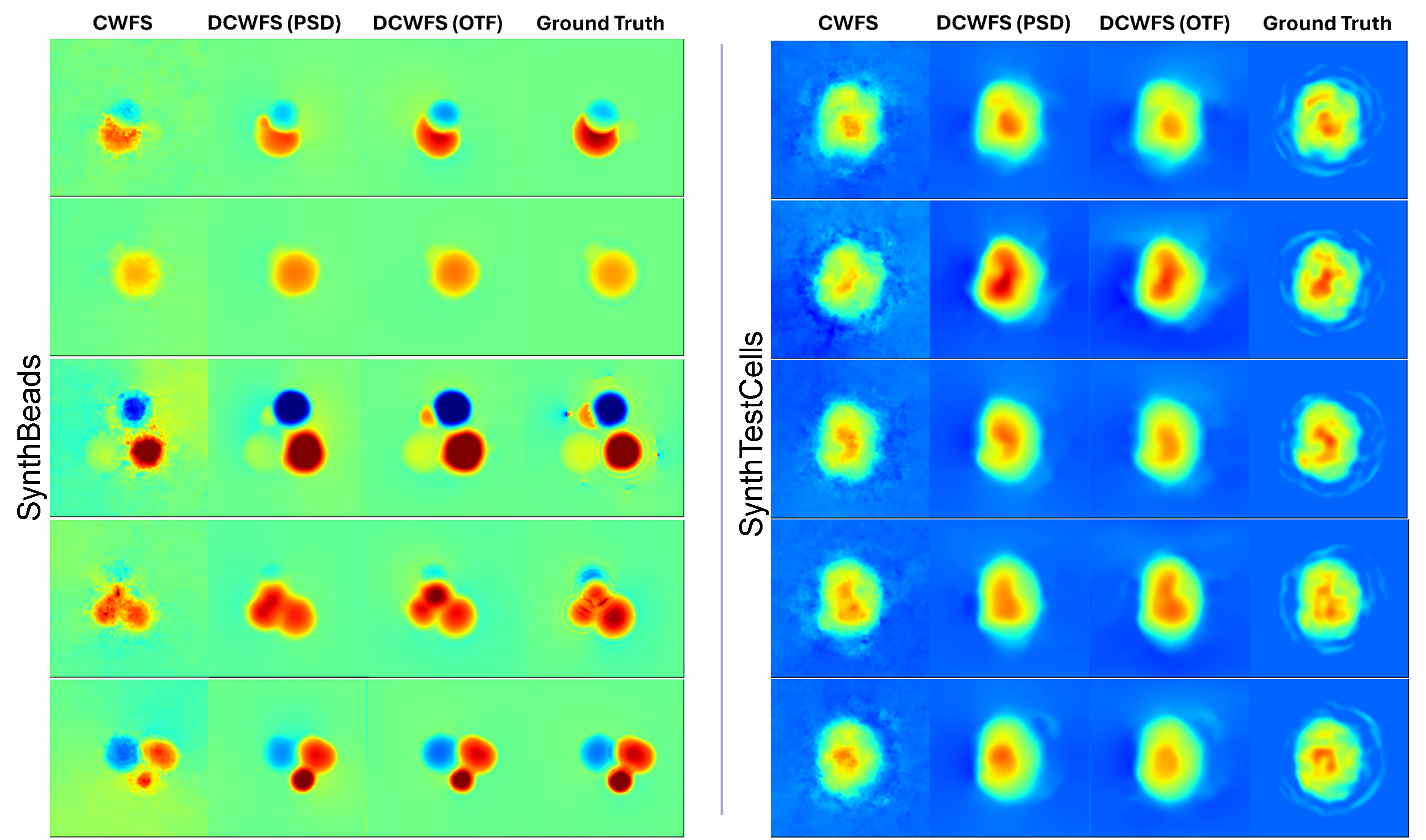 We show two sets of results in the following. Firstly, we show the performance of the finetuned networks on synthetic data. We compare the performance of the network finetuned on SynthBeads, named DCWFS, with the performance of the pretrained network and the traditional ADMM-based method, named CWFS. On the test split of SynthBeads, DC-WFS outperforms other methods, while on SynthTestCells, CWFS edges out our method. The pretrained network, without finetuning on SynthBeads, fails to estimate and produces estimates with large errors (not shown below, table in the article).