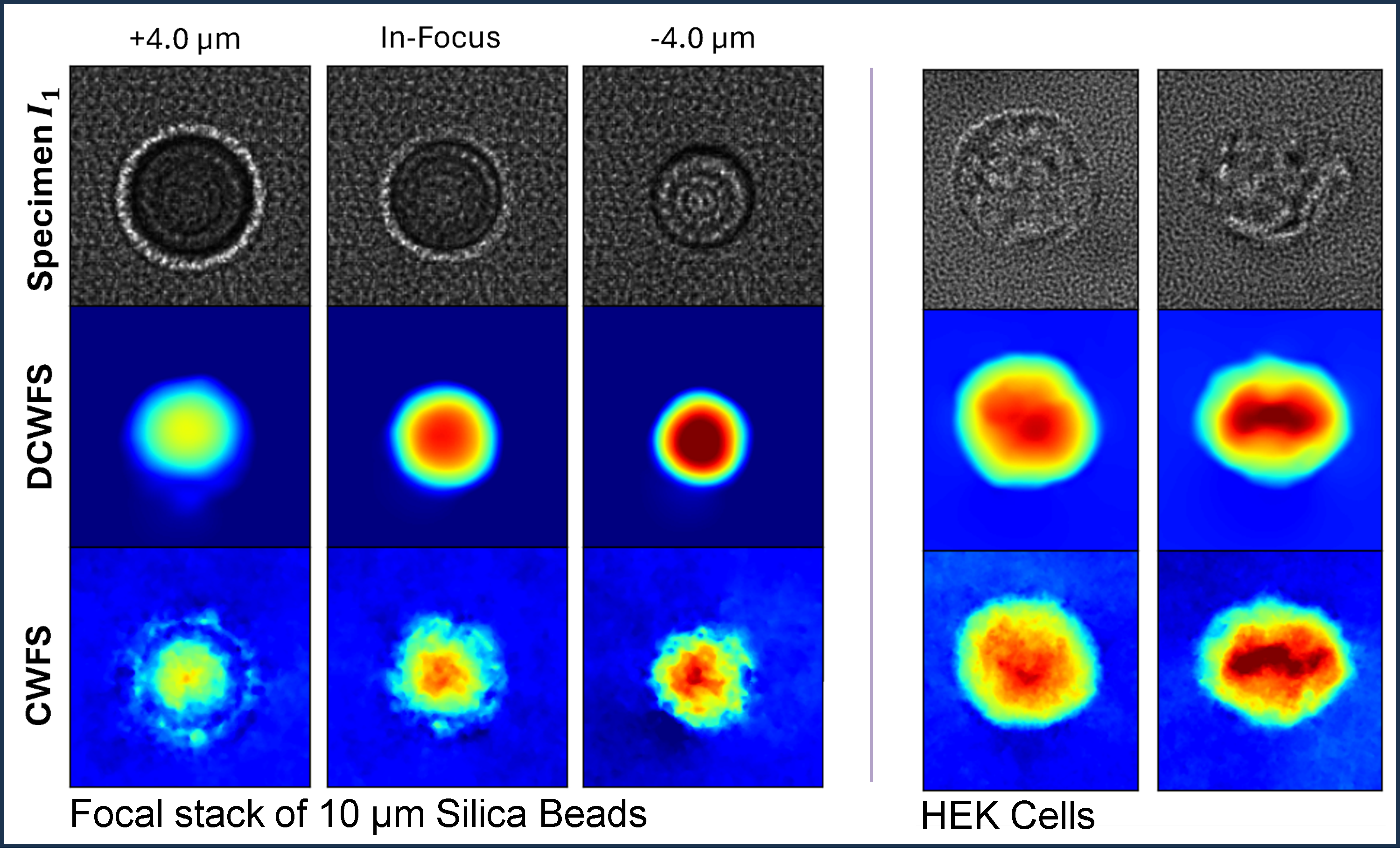 Secondly, we compare the performance of real measured data. Here, we do not possess the ground truth, so the comparison is largely qualitative. We measure microbeads and real HEK cells using CWFS hardware. We retrieve the phases with the traditional method and DC-WFS. For the microbeads, as it is a simple spherical object with a constant refractive index, we can accurately estimate that the OPD is smooth and the maximum OPD is the geometric delay. Given our expectations, we see that DC-WFS outperforms CWFS, indicating no domain gap between simulated and real data. For the HEK cell results, we can see that DC-WFS, as with SynthTestCells, generalizes to complex unseen biological data. However, the outputs of DC-WFS may be smooth, as is evidenced by the SynthTestCells, where certain details in the interior are merged, reflecting a low-resolution estimate.