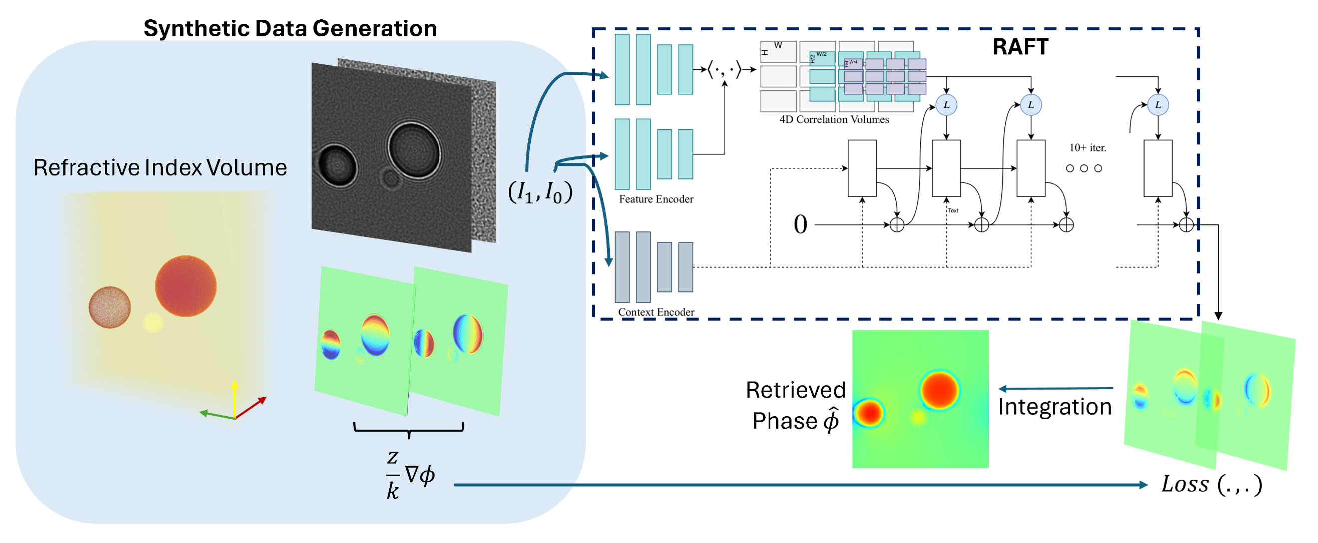 The purely optical flow relationship is only partially true in Coded WFS microscopy applications. The propagation of the wavefront by a distance z introduces amplitude variations as well as other features such as diffraction, which are inherent to microscopy. We propose leveraging pretrained optical flow networks by finetuning them with Coded WFS data, one that includes speckles, diffraction, and other microscopy features, so that the networks learn the mapping in the presence of these features, as shown below.
